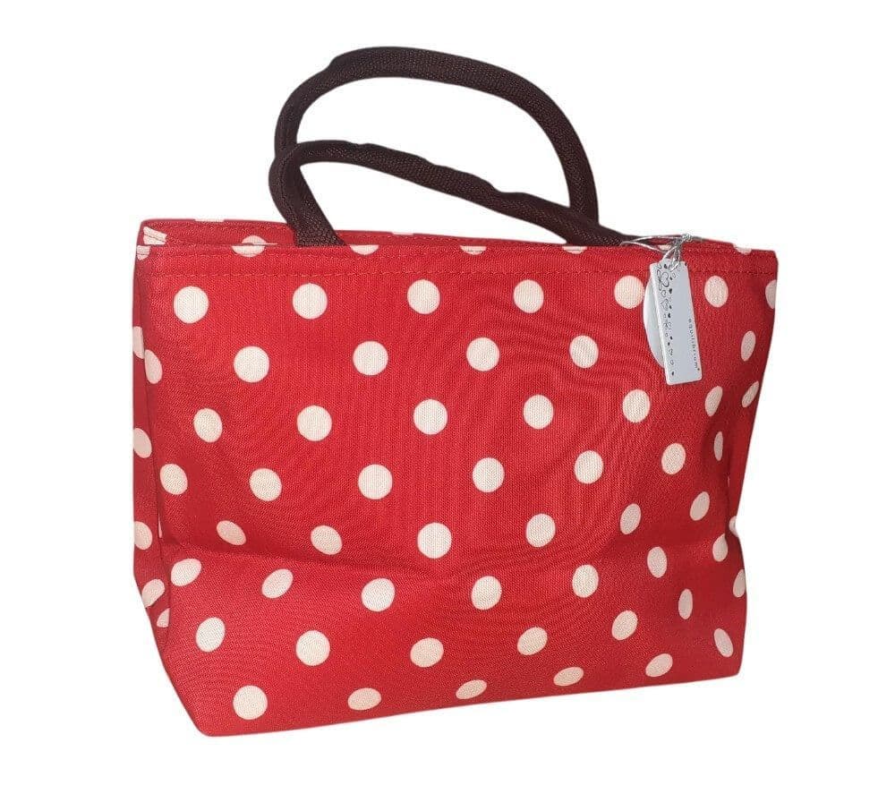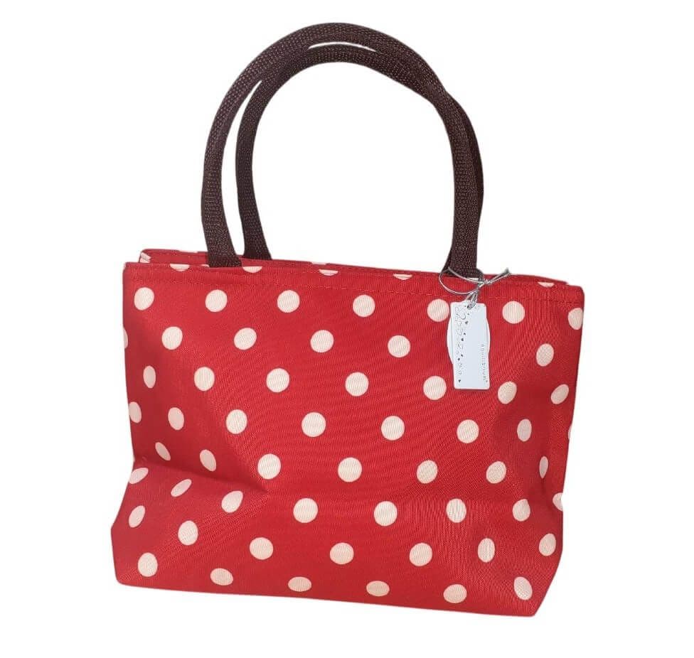 Introducing the Spots Waterproof Handbag in a striking red and cream design, a stylish and practical accessory perfect for everyday use. Measuring a convenient 19.0cm by 31cm (excluding handles), this handbag offers ample room for all your essentials without being bulky, making it ideal for busy days on the go. Crafted from high-quality, waterproof material, it protects your belongings against unpredictable British and Irish weather, ensuring your valuables stay dry and secure.